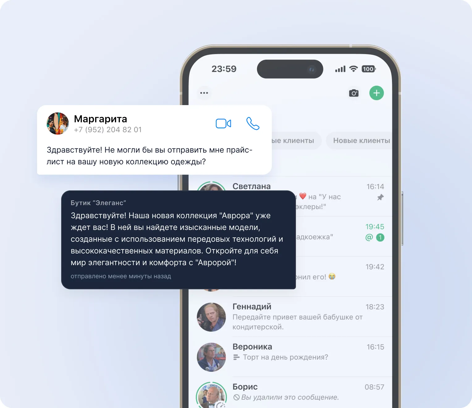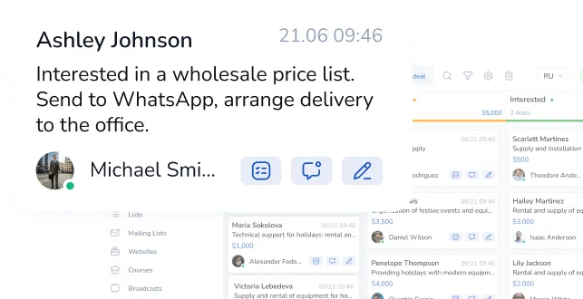 - Удобное управление клиентской базой и историями сообщений в CRM.
