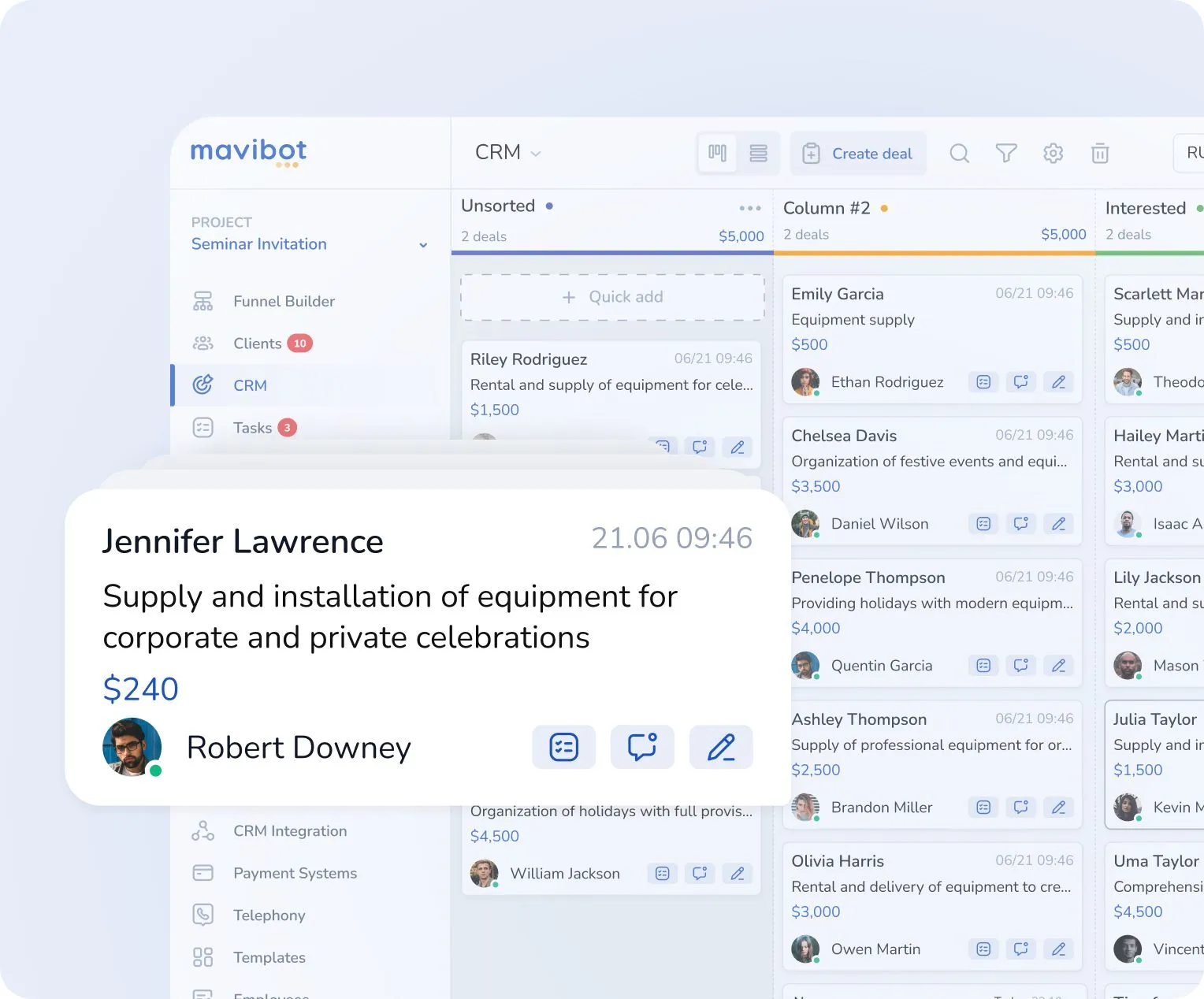 Salebot автоматически создаёт сделки в CRM: просто включите «Принимать лидов на первый этап воронки», и данные каждого клиента, который вам написал, попадут в систему. Также можно настроить создание сделок на любом этапе CRM.