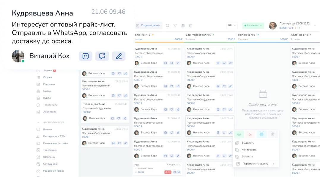 - Чат-менеджер и CRM в одном месте: Мы настроили чат-менеджер, который собирает сообщения из WhatsApp*, Авито, ВКонтакте и Telegram в единую систему. Все обращения отображаются в удобной CRM, где менеджеры видят полную историю переписки, источник заявки и текущий статус.